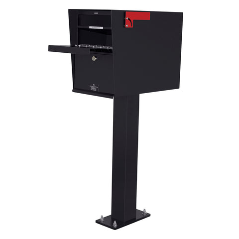 Outgoing mail is placed in the lower compartment for carrier pick-up. Delivered mail is deposited into the incoming slot at the top of the box. Mail automatically drops inside the box and out of reach. Mail is retrieved from the locked access door located either in the front or back of the box.
